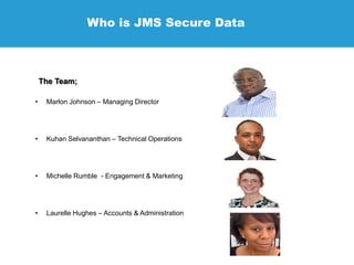 JMS Secure Data is a specialist in data protection services, offering solutions to ensure compliance for businesses with data protection licenses. Their services include risk assessments, technical implementation, and ongoing support to safeguard confidential data across various sectors. They emphasize the necessity of encryption to protect sensitive information, detailing their offerings such as secure cloud sharing, data backup, and compliance with data protection regulations.