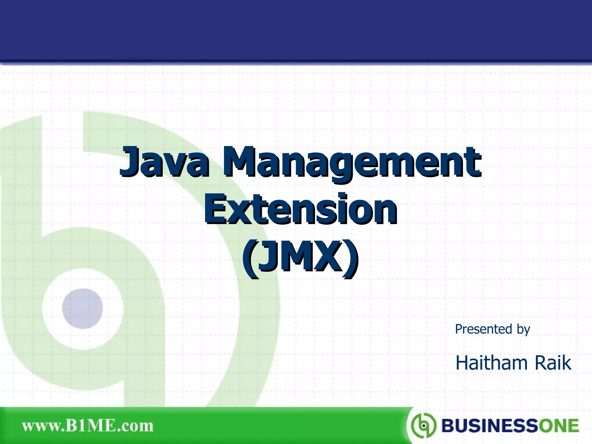 The document provides an overview of Java Management Extension (JMX), which is an API for managing Java applications. It describes key aspects of JMX including its architecture, MBeans, the MBean server, JMX agents, and remote access. It also discusses standard and third-party implementations and tools for JMX.