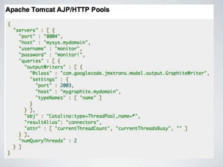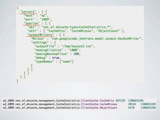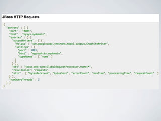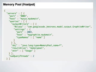 The document discusses JMXTrans, a tool for using Java Management Extensions to communicate remotely with Java virtual machines and gather statistics from various services. It highlights its capabilities for performance and scalability, allowing integration with multiple systems and ease of configuration. Future developments include a GUI editor and additional output writers for enhanced functionality.