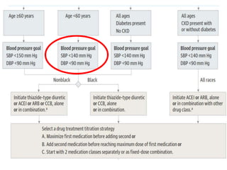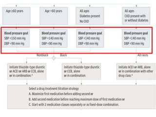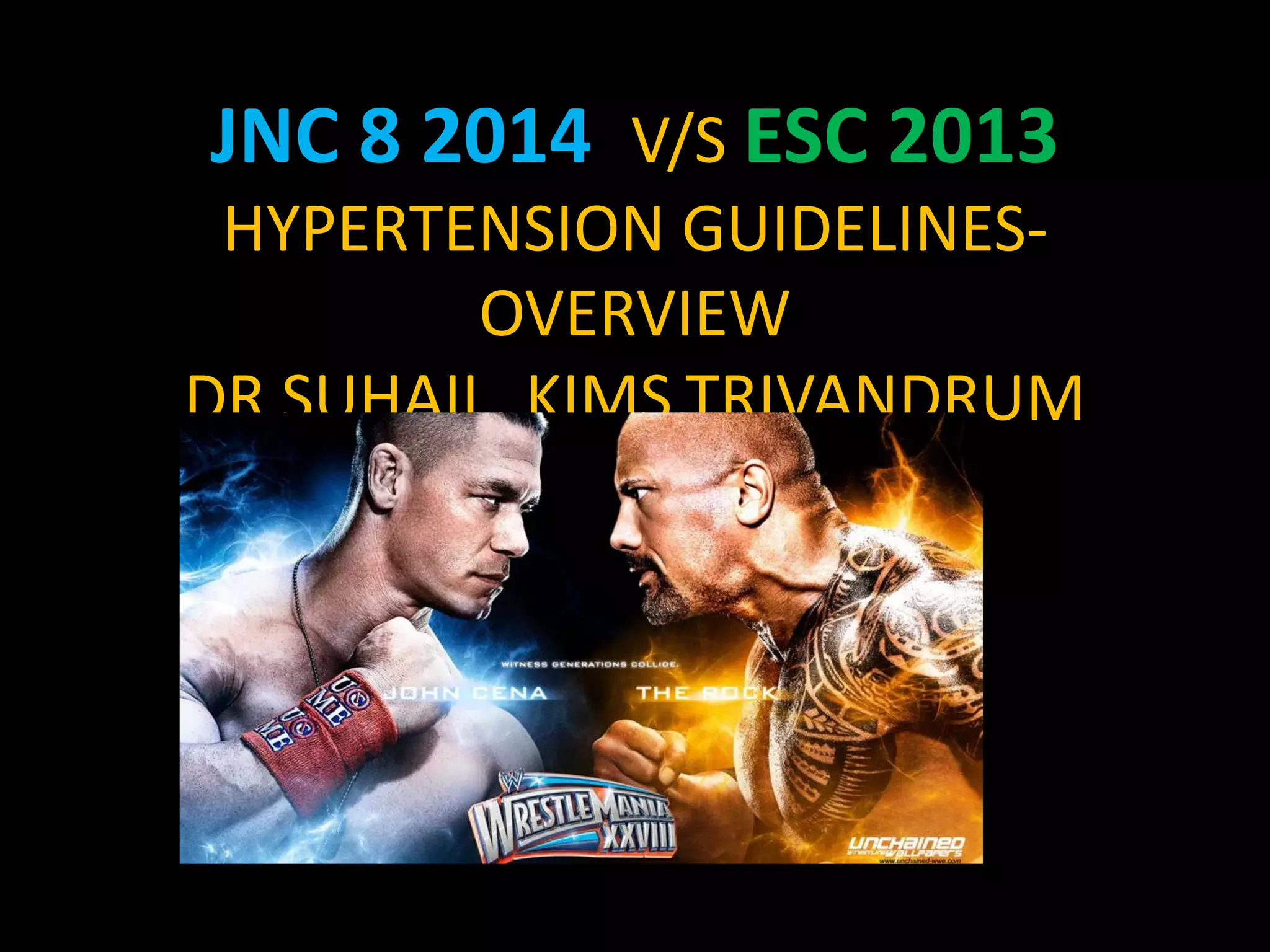 The document compares the 2013 European Society of Cardiology (ESC) hypertension guidelines to the 2014 Eighth Joint National Committee (JNC 8) guidelines. Some key differences include: ESC defines pre-hypertension while JNC 8 does not, ESC recommends lifestyle changes for pre-hypertension while JNC 8 does not, and ESC recommends beta-blockers as first-line treatment while JNC 8 recommends thiazide diuretics, ACE inhibitors, ARBs, or CCBs as first-line based on clinical trials. Both guidelines relax blood pressure targets for elderly patients over 60 or 80 years old, respectively.