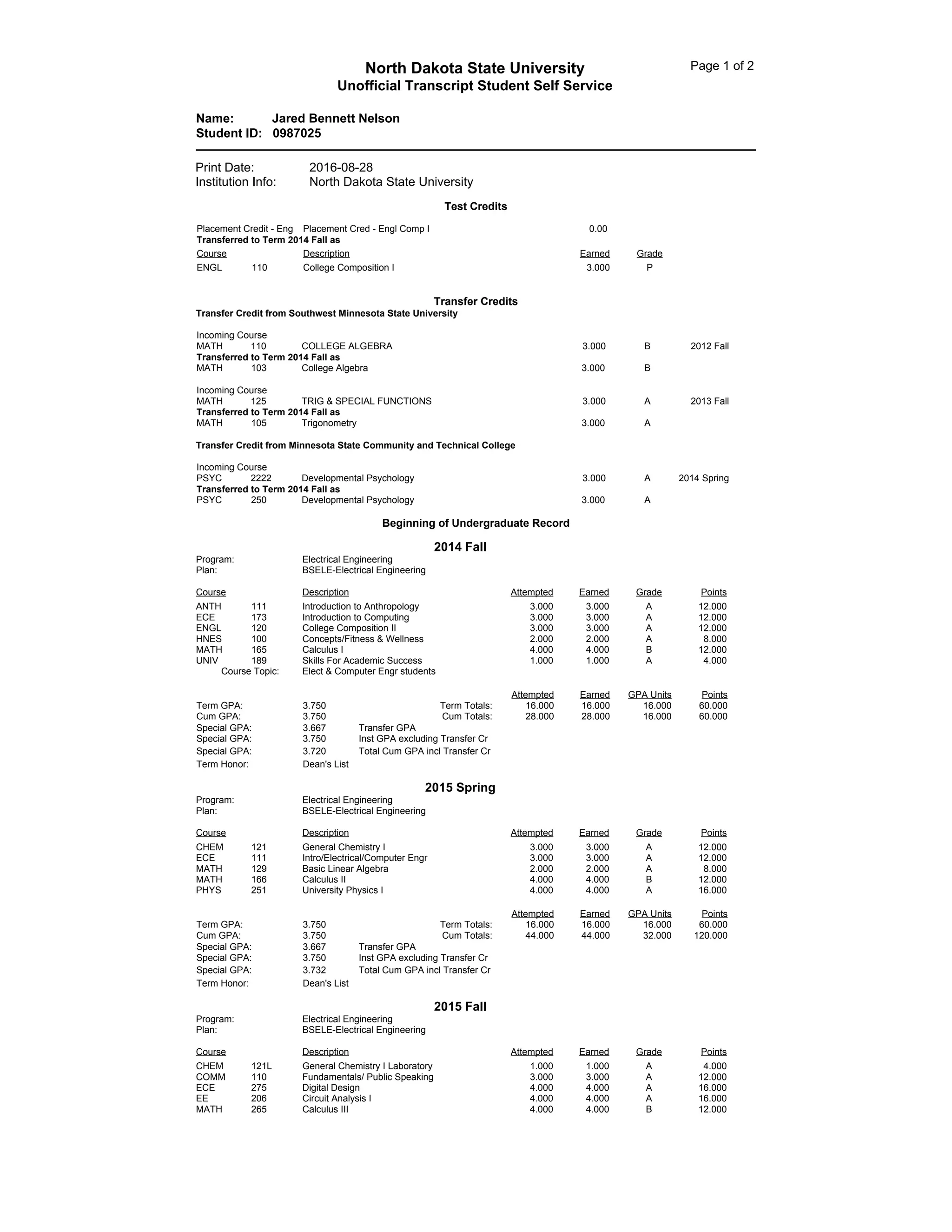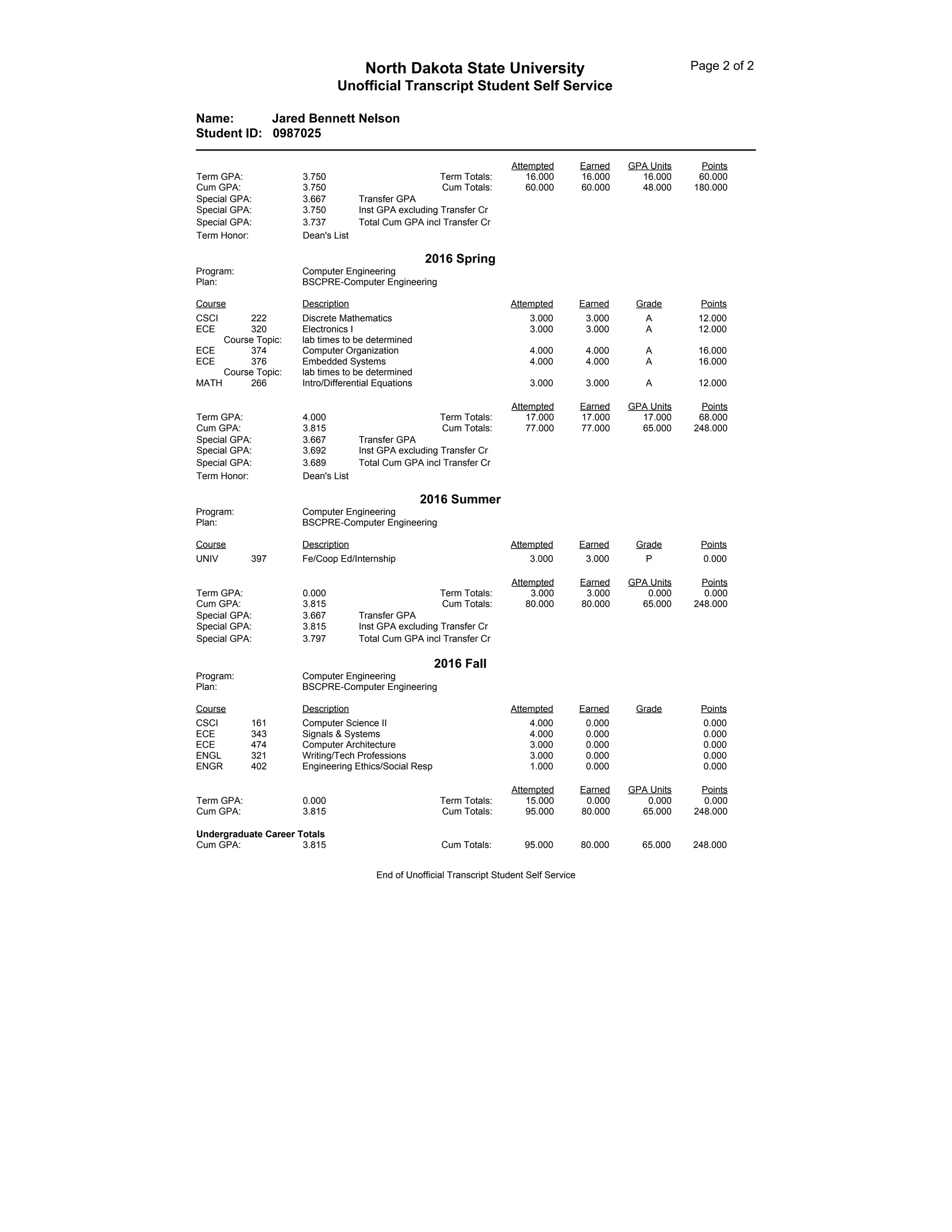 Jared Bennett Nelson is a student at North Dakota State University pursuing a degree in Computer Engineering. His transcript shows that he transferred credits from two other colleges and has maintained a cumulative GPA of 3.815 over the course of his undergraduate career at NDSU. His coursework includes general education requirements as well as core computer engineering classes, and he has made the Dean's List multiple semesters.