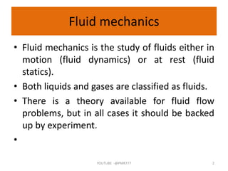 The document covers the fundamentals of fluid mechanics, including the properties and behavior of fluids under shear stress, the historical development of fluid mechanics concepts, and essential principles like Pascal's law and pressure measurement techniques. Key figures in the field are highlighted, along with their contributions, while also discussing applications in various engineering domains. It explains the classification of fluids, the role of viscosity, and the measurement of fluid pressure using manometers.