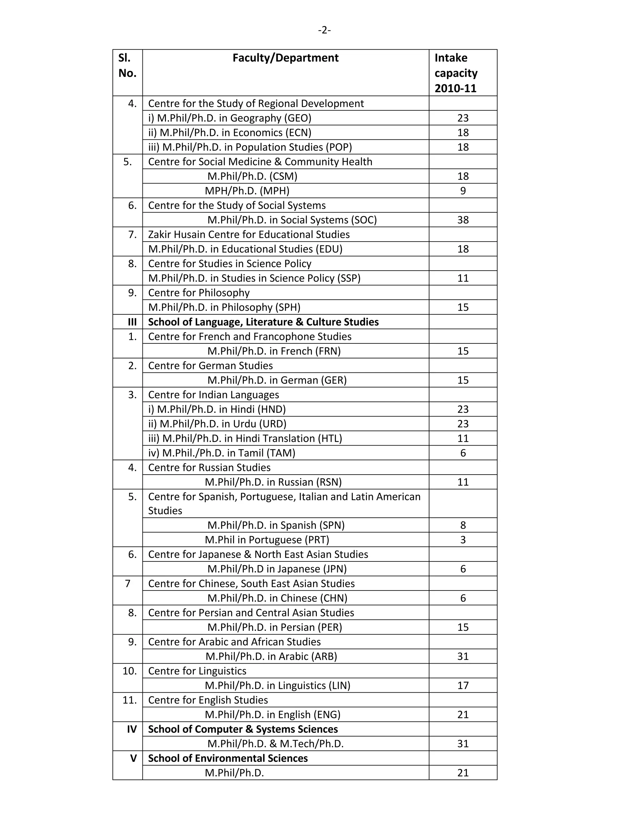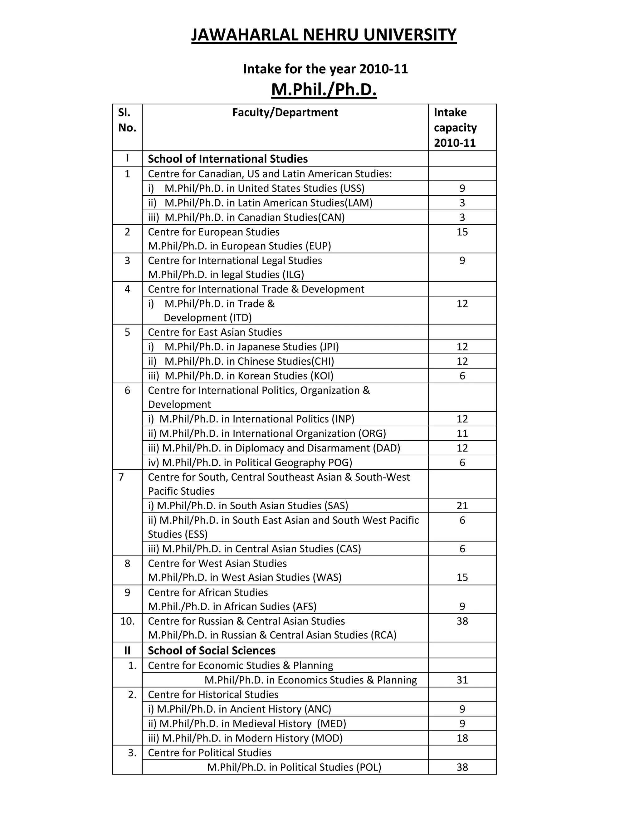 The document lists the intake capacity for various M.Phil, Ph.D, M.Tech, M.A, and M.Sc programs at Jawaharlal Nehru University for the year 2010-11. It provides details of over 50 departments/centers across 13 schools, specifying the number of seats available for each program. The intake ranges from 2 to 92 seats per program.