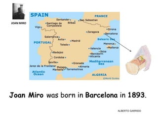 Joan Miro was born in Barcelona in 1893 and started painting at age 8 with simple works. After visiting Paris in 1920 and meeting artists like Picasso, he began incorporating bright colors, shapes, and symbols from his dreams into his paintings. He was also a sculptor and tapestry artist. In 1959, Miro moved to Majorca, where he had a studio and lived until his death at age 90 in 1983.