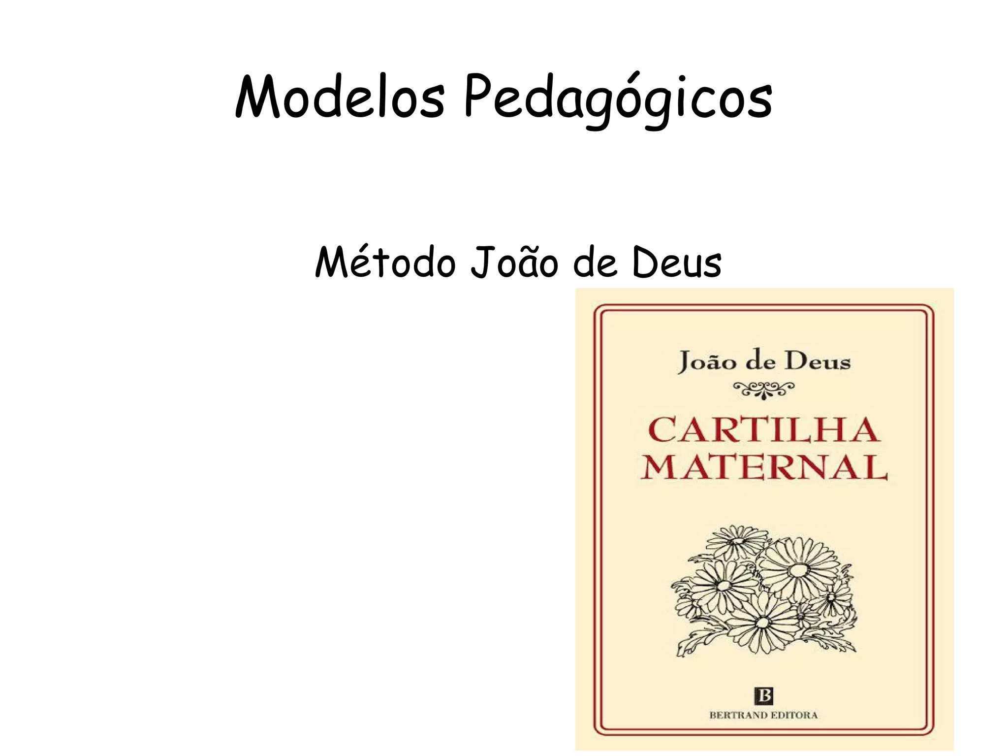 O método João de Deus foi um método de ensino português do século XIX que privilegiava a aprendizagem da leitura, escrita e aritmética e utilizava cartilhas. Foi desenvolvido por João de Deus e tornou-se o método oficial português em 1888, sendo amplamente utilizado até 1903.
