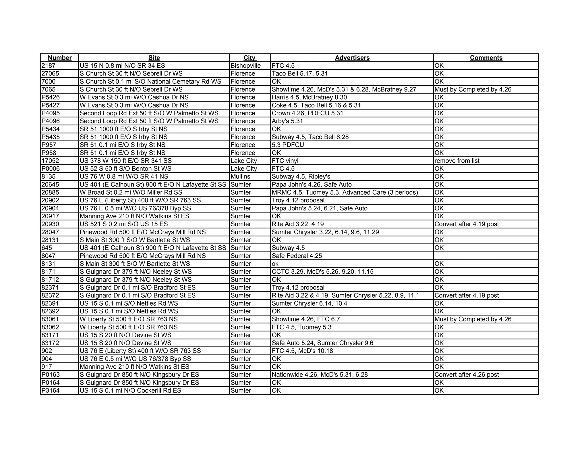 This document contains a list of advertising locations with details like the site address, size of face, and scheduled tasks like posting or taking down ads. It also includes notes on designs and inventory for some locations. The tasks seem to be part of multiple advertising contracts for companies like Taco Bell, Bank of Clarendon, and Advanced Cardiology Consultants.