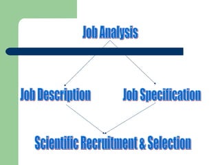 This document discusses job analysis and job design. It defines a job and explains that job analysis is the systematic process of collecting information about a job such as duties, responsibilities, skills required, and work conditions. The key components of job analysis are the job description, which provides details of what the job entails, and the job specification, which outlines the qualifications needed. Job design involves configuring jobs to meet organizational needs while satisfying employees. Different techniques of job design discussed are job simplification, enlargement, enrichment, and rotation.