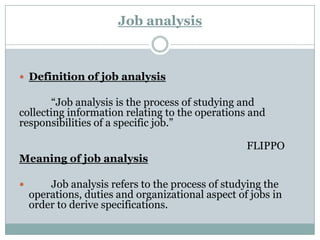 Job analysis is the process of studying and collecting information about the operations, responsibilities, duties, and organizational aspects of specific jobs. It provides a detailed analysis of the job title, required skills and qualifications, tasks and duties, tools and equipment used, and relationships with other roles. The objectives of job analysis include work simplification and improvement of productivity, establishing work standards and performance expectations, and providing data to support human resource functions like recruitment, selection, training, and performance evaluation. Job design is the process of structuring job content, responsibilities, relationships, and methods to improve technical efficiency and job satisfaction by creating a good match between job requirements and human attributes.
