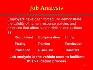This document provides an overview of job analysis and outlines the key steps involved in conducting a job analysis. It discusses collecting and editing job data through activities like interviewing incumbents, having them identify major job activities and duties. The goal is to accurately describe all tasks, skills, and requirements of a job in a clear, unambiguous way. Conducting a thorough job analysis helps organizations with important human resource functions like recruitment, compensation, and validating job-related policies.
