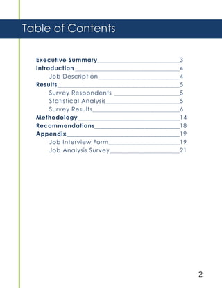 This job analysis report summarizes the results of a job analysis conducted for the Senior Recruiter position at AMTIS, Inc. A questionnaire was administered to three subject matter experts to gather data on the tasks, responsibilities, knowledge, skills, abilities, and other characteristics required for the position. The results identified locating qualified applicants, communicating with candidates and hiring managers, and planning recruitment strategies as key functions of the role. Key qualifications included knowledge of discrimination laws, strong interpersonal and communication skills, and the ability to maintain confidentiality. The job analysis provides a comprehensive overview of the essential elements of the Senior Recruiter position.