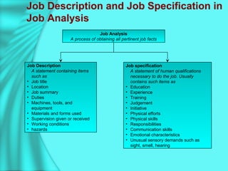 This document discusses job analysis, which involves analyzing jobs to develop job descriptions and specifications. It defines job descriptions as statements containing details of job duties, equipment used, supervision, and working conditions. Job specifications define the necessary human qualifications, such as education, experience, skills, and traits. The document outlines the process of job analysis and methods for collecting job data. It explains that job analysis provides competitive advantages and is used for personnel planning, performance appraisal, hiring, training, job evaluation, health and safety, and other functions.