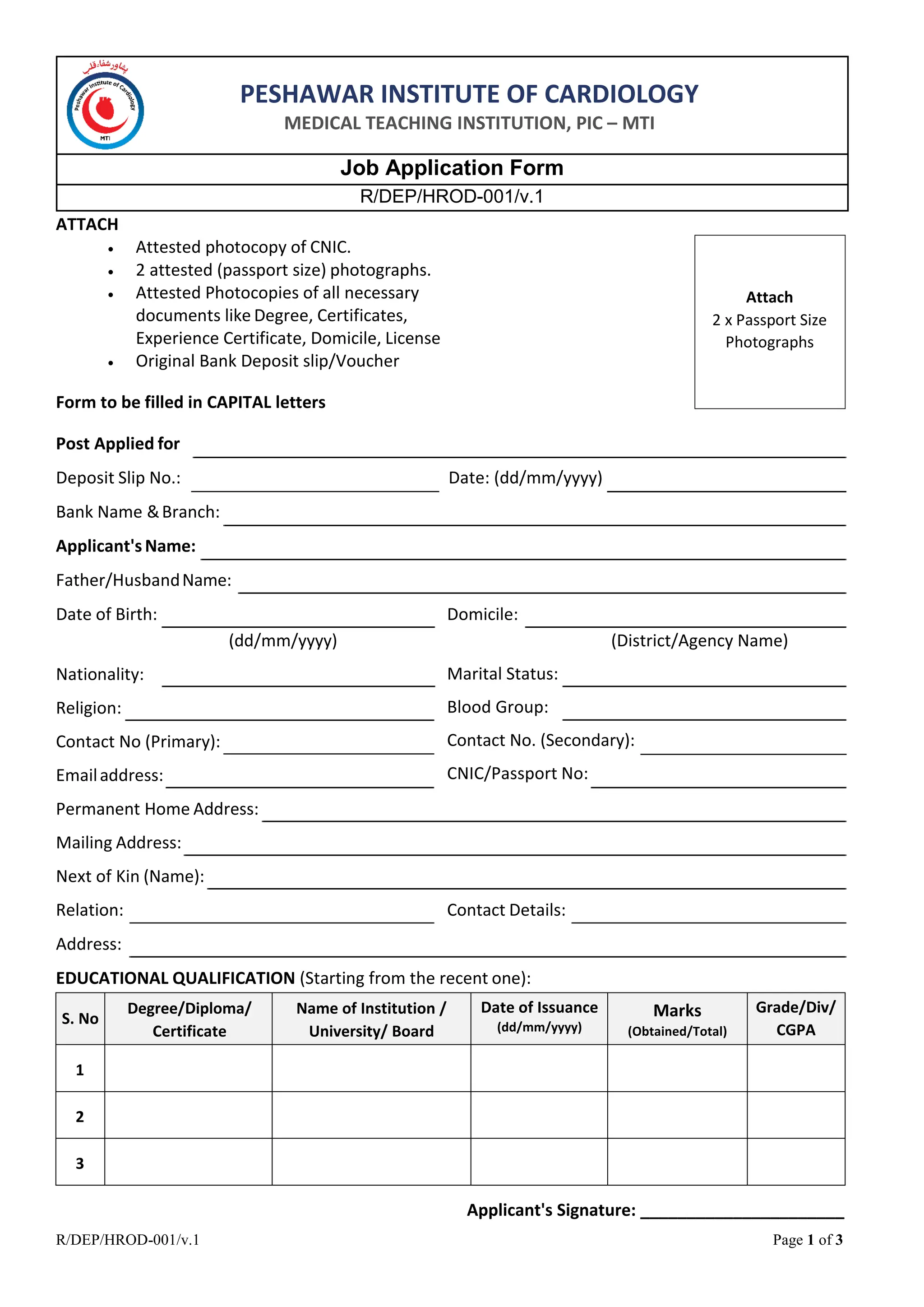 The document is a job application form for the Peshawar Institute of Cardiology Medical Teaching Institution, requiring applicants to provide personal details, documents, and professional experiences. It includes sections for educational qualifications, professional courses, language proficiency, and references, along with declarations regarding disabilities and criminal records. The application emphasizes that incomplete forms or those submitted after the deadline will not be accepted, and only shortlisted candidates will be contacted for further processes.