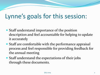 The document discusses Lynne's goals for a staff session on position descriptions and performance evaluations. It aims to help staff understand the importance and purpose of these documents, feel accountable for updating their position descriptions accurately, and feel comfortable providing feedback for annual performance appraisals. More specifically, it wants staff to understand the significance of position descriptions, how performance evaluations work, and the expectations of their jobs. The rest of the document provides details on what position descriptions and performance evaluations are, why organizations need them, how Catawba County uses them, and tips for staff to prepare for and make the evaluation process more positive.
