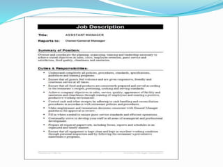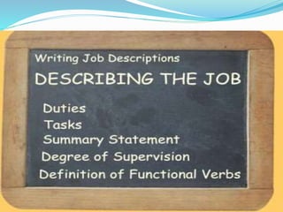 A job description outlines the key duties and responsibilities of a specific position, including the job title, location, required qualifications, reporting structure, and tasks. It also lists any tools, equipment, or materials used, as well as working conditions and relationships with other roles. However, job descriptions can become outdated and limit flexibility as organizations and roles evolve over time.