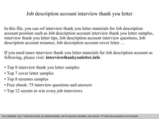 The document provides resources for writing thank you letters after interviews for accounting job positions. It includes samples of thank you letters, tips for writing effective letters, and links to additional materials like resume examples, cover letters, lists of common interview questions, and strategies for job searching. Key resources mentioned are top samples of thank you letters, resumes, cover letters, and a free ebook with common interview questions and answers.