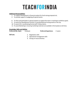 The Associate- Finance and Administration position in Delhi is responsible for executing day-to-day finance operations, managing infrastructure and events, and providing administrative support. Primary responsibilities include maintaining financial records, processing payments, coordinating recruitment and training logistics, and overseeing vendor agreements. The role requires a graduate degree and 2+ years of experience, as well as skills in negotiation, operations management, and resourcefulness.