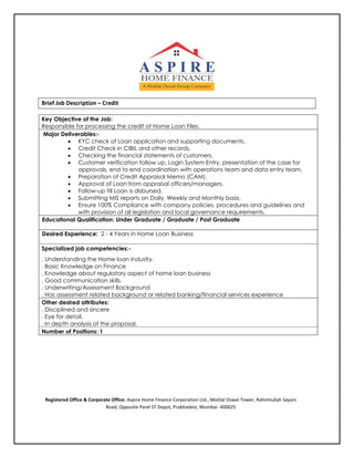 The document outlines a job description for a position responsible for processing home loan credit applications. Key responsibilities include KYC checks, credit checks, financial statement reviews, and coordination with various teams until loan disbursement, ensuring compliance with regulations. The role requires 2-4 years of experience in the home loan sector and relevant competencies in finance and communication.
