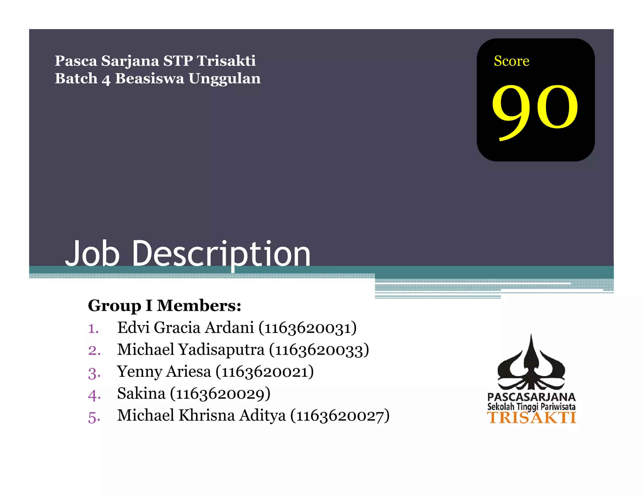 This document lists the members of Group 1 for a Pasca Sarjana STP Trisakti batch 4 scholarship program. It includes the names and student IDs of 5 students: Edvi Gracia Ardani, Michael Yadisaputra, Yenny Ariesa, Sakina, and Michael Khrisna Aditya.