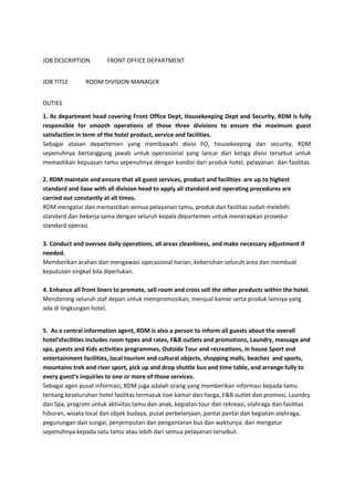 Dokumen ini adalah deskripsi pekerjaan untuk posisi Room Division Manager di departemen front office, mencakup tanggung jawab utama seperti memastikan operasional yang lancar, pelayanan tamu yang berkualitas tinggi, dan pengelolaan semua departemen terkait. RDM juga bertanggung jawab untuk komunikasi dengan tamu, pengawasan jadwal kerja staf, serta menangani keluhan dan masukan dari tamu. Selain itu, RDM diharapkan menjadi pemimpin teladan dan melakukan evaluasi kinerja karyawan serta melaporkan kepada manajer umum.