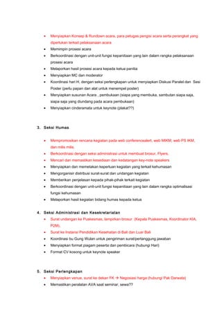Dokumen tersebut merangkum pembagian tugas dan koordinasi untuk penyelenggaraan Seminar Nasional Urbanization and Health 2010. Terdapat 9 seksi yang meliputi ilmiah, acara, humas, administrasi, perlengkapan, konsumsi, transportasi dan akomodasi, dokumentasi dan publikasi, serta pembantu umum. Setiap seksi memiliki tugas dan tanggung jawab tersendiri dalam penyelenggaraan seminar.