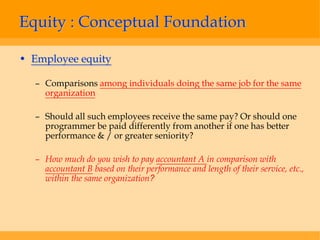 Job evaluation involves systematically evaluating jobs within an organization based on factors like skills, effort, responsibility, and working conditions to determine their relative worth and establish a pay structure. Common methods of job evaluation include ranking, classification, factor comparison, and point methods which break jobs down and compare them based on compensable factors. The goal of job evaluation is to establish equity and fairness in compensation by objectively assessing the value of different jobs within an organization.