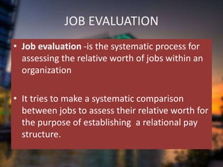 This document provides details about a job evaluation case study conducted by Hongkong Electric Company in 1984. The company hired an external consultant to design and evaluate benchmark jobs to establish a new salary scale. Job descriptions were developed for benchmark positions through interviews. A benchmark committee evaluated the jobs and scored them on factors like knowledge, problem-solving, and accountability. Over 800 non-benchmark jobs were also evaluated by comparing them to benchmark jobs, with the results reviewed by a non-benchmark committee. The goals of the job evaluation were to increase pay fairness and reduce disparities between local and expatriate salaries.