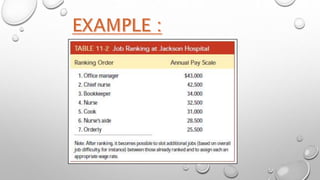 This document discusses job evaluation, which is a systematic process to determine the relative worth of jobs within an organization. It mentions the merits and demerits of job evaluation as well as the common methods used, which include ranking, grading, point rating, and factor comparison. The summary evaluates jobs based on factors like skills, effort, training, responsibilities, and assigns weights or points to determine each job's value in order to establish a rational pay structure.
