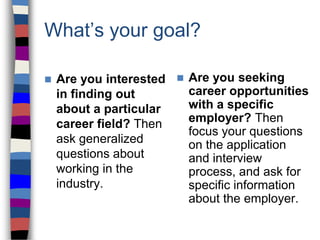 The document provides tips and guidance for effectively preparing for and participating in a job fair. It emphasizes the importance of researching companies attending, having a 30-second introduction prepared that highlights relevant skills and interests, dressing professionally, bringing multiple resume copies and a notepad, actively engaging with employers through questions, obtaining contact information, and following up with a thank you note. The goal is to stand out from other job seekers and learn how to secure potential interviews or opportunities. Key aspects employers expect include knowledge of the job/company and demonstrating communication skills, preparation, and enthusiasm.