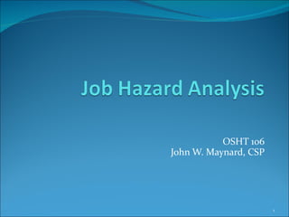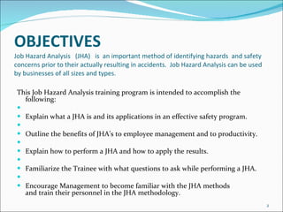 This document provides an overview of job hazard analysis (JHA). It explains that a JHA identifies hazards associated with each step of a job in order to develop solutions to remove or control hazards. The document outlines benefits of a JHA such as improved safety, efficiency, planning and selection of qualified workers. It provides guidance on performing a JHA, including questions to consider for each job step and recommended procedures after completing a JHA.