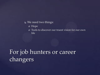 The document provides career and job hunting advice. It discusses the importance of having hope and tools to discover one's vision for life. It recommends aiming high and identifying a passionate job, while also acknowledging that the job search process involves rejection. The document provides tips for different ways to look for jobs, deal with handicaps, use resumes and contacts, interview successfully, and choose a new career when necessary. Overall, the key messages are to remain optimistic and passionate, use multiple search strategies, and view one's skills as offering value to employers.
