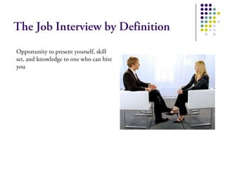 This document provides information about a personality development and job interview seminar given by Prof. Silvia C. Ambag at STI-COLLEGE MEYCAUAYAN on February 21, 2013. It discusses keys to successful interviews, including preparation, research, practice, proper attire, personality aspects, types of interviews, and tips for during and after the interview. The document also addresses common myths and facts about interviews.