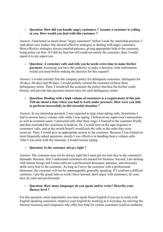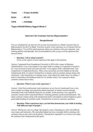 The document contains an interview preparation guide for an inexperienced applicant applying for an entry-level customer service representative position at a bank. It includes sample questions and recommended answers to common interview questions focusing on the applicant's education, work experience, customer service skills, and ability to handle difficult customer situations. The guide provides advice on highlighting relevant skills and experiences while addressing lack of direct work experience.