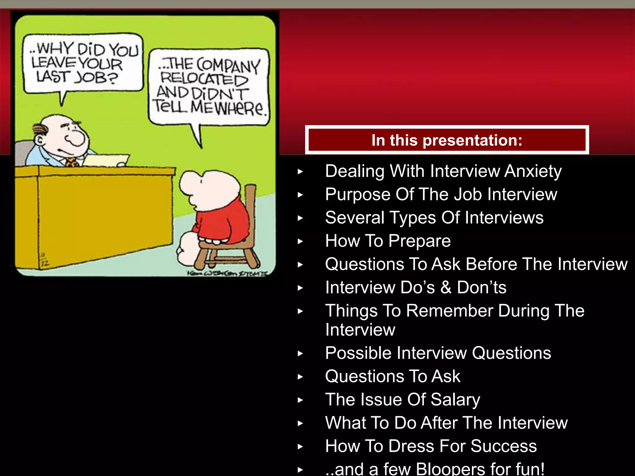 This document summarizes tips for preparing for a job interview, including dealing with anxiety, types of interviews, questions to ask, dress recommendations, and common mistakes to avoid. Key points covered are preparing answers to common questions, researching the company, having questions prepared, maintaining eye contact and positive body language during the interview, following up with a thank you note, and dressing professionally and conservatively. Common applicant mistakes highlighted include showing up sick, being unprepared or disinterested, and inappropriate dress or behavior.