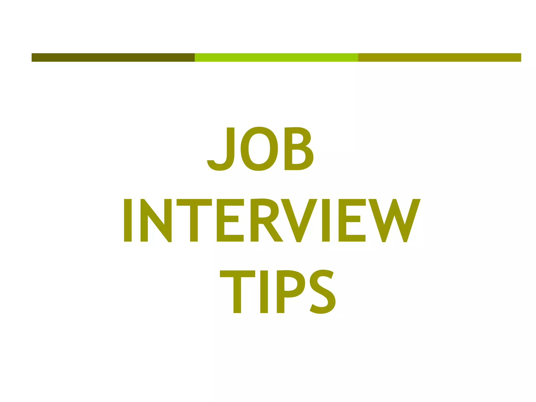 The document provides 10 tips for job interviews: 1) Over-prepare for possible questions, 2) Be clear on your relevant experience and job objectives, 3) Ensure your responses align with your resume claims, 4) Emphasize strengths relevant to the position, 5) Frame weaknesses as strengths, 6) Be forthright about past firings, 7) Have a general career goal rather than a specific plan, 8) Articulate clear personal standards, 9) Assess if the position meets your needs, and 10) Know your worth and be prepared to negotiate salary within reasonable limits.