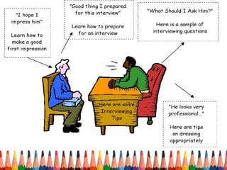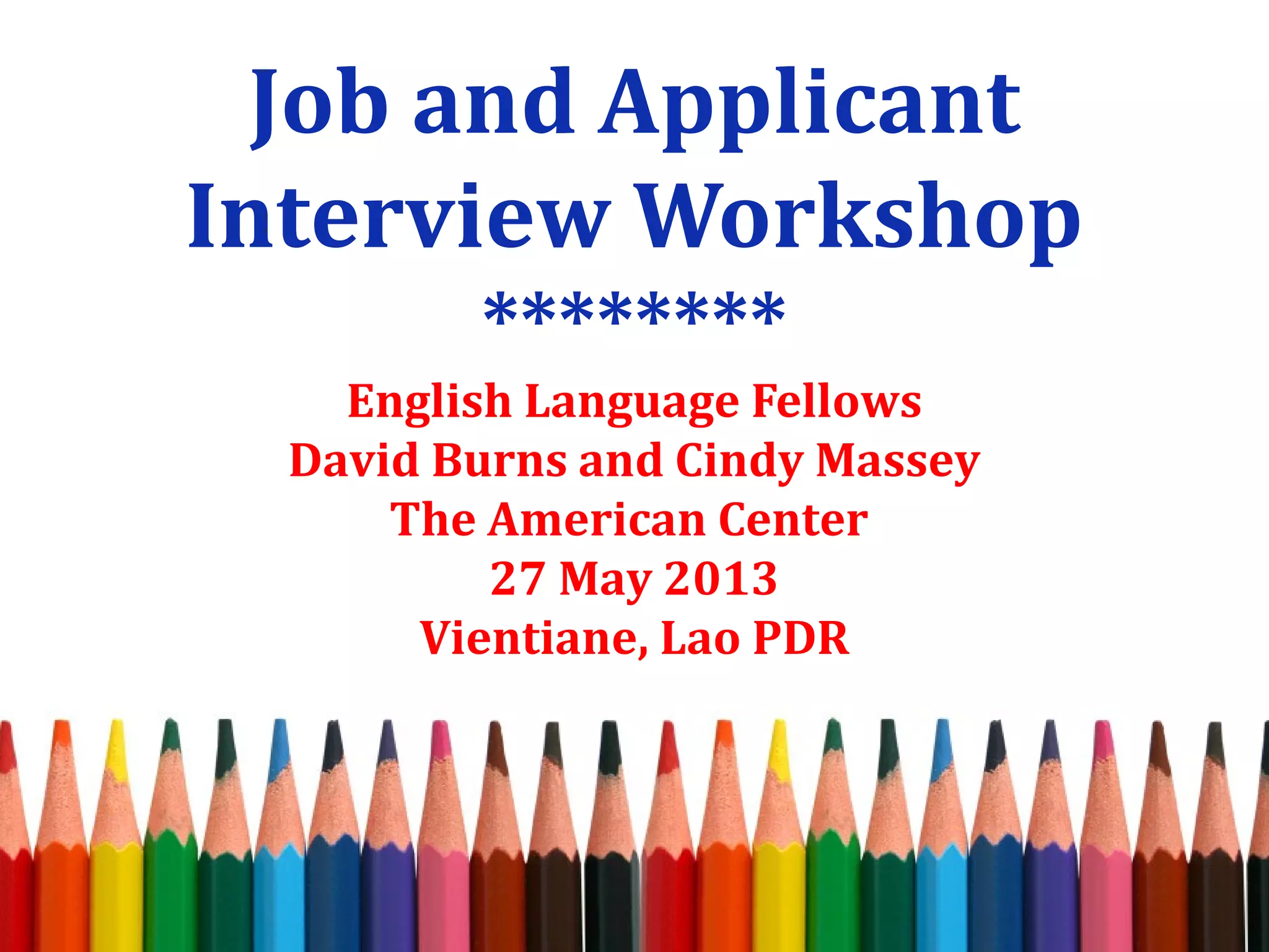 This document summarizes a workshop on job interviews given by two English Language Fellows in Laos. It provides information about the presenters and an overview of the topics and activities covered in the workshop, including preparing for an interview, cultural differences between interviews in the US and Laos, common interview questions, and resources for studying in the US and improving English skills.