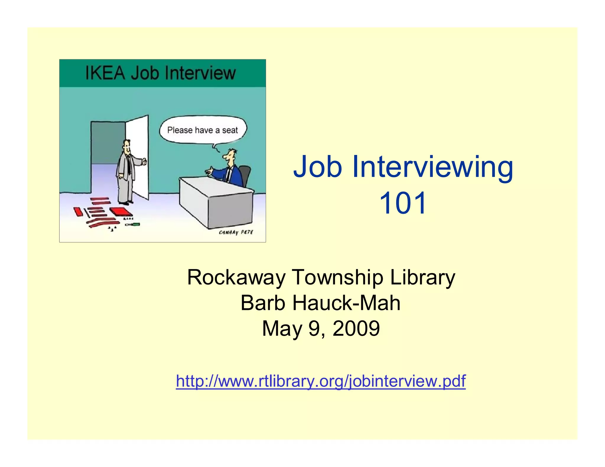 This document provides an overview of a job interviewing workshop that teaches attendees the 4 P's of successful interviewing: preparation, presentation, persuasion, and practice. It covers topics like identifying strengths, researching the company, dressing appropriately, answering common interview questions, asking questions of the interviewer, discussing weaknesses, handling illegal questions, and following up after the interview. The workshop aims to help job seekers learn how to present themselves positively and persuade interviewers that they are the best candidate.