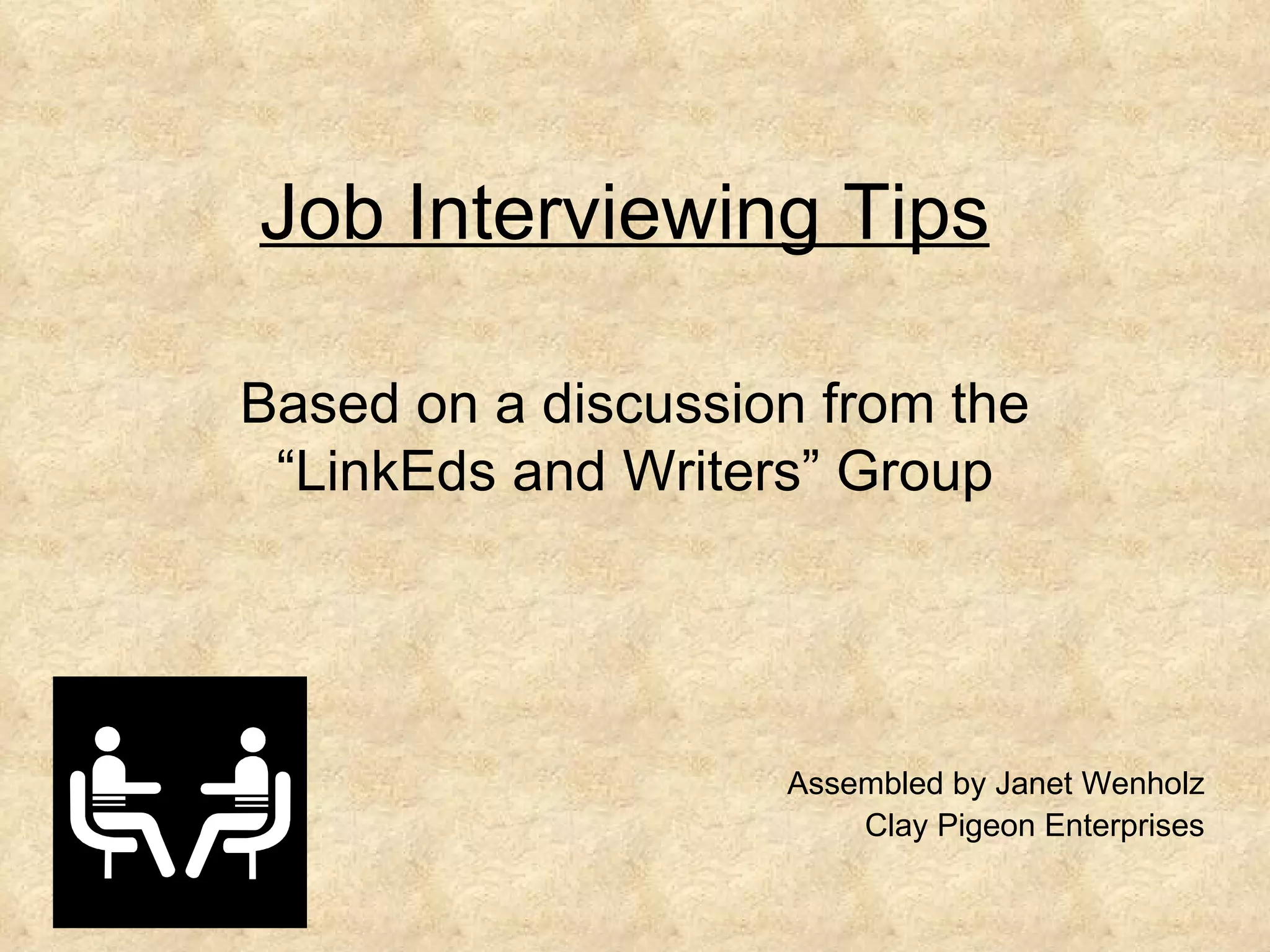 The document provides job interviewing tips organized under four main headings: be yourself, be prepared, be organized, and be considerate. It offers specific advice such as researching the company beforehand, preparing relevant questions to ask, bringing copies of relevant materials, and following up with a thank you note after the interview. The tips are meant to help a job seeker feel comfortable, show they have done their research, and make a good impression during an upcoming interview.