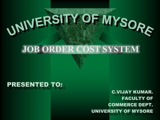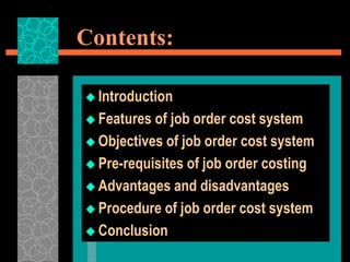 This document provides an overview of a job order cost system. It describes job order costing as a method used when production is done according to customer orders rather than for stock. Each job has a unique cost that is tracked from start to finish using a job cost sheet. The objectives are to determine the accurate cost of each job and identify profitable versus unprofitable jobs to aid future estimates. The key aspects of job order costing include distinct work orders for each job, tracking direct and overhead costs accumulated to each job, and comparing estimated versus actual costs for process improvement and pricing future jobs.