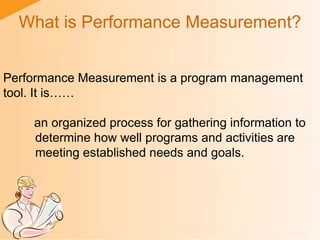 Performance measurement is a program management tool used to determine how well programs and activities are meeting established needs and goals. There are five types of performance measures - input, output, process, impact, and outcome measures. Performance measurement provides benefits such as setting goals and standards, detecting and correcting problems, gaining insights into effectiveness and efficiency, and determining if organizations are meeting strategic goals. An effective performance measurement process involves identifying critical activities and goals, establishing measurements, collecting data, analyzing actual performance, comparing to goals, and taking corrective actions if needed.