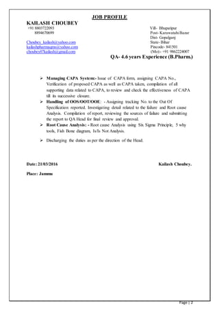 Kailash Choubey has over 4.6 years of experience in quality assurance roles. His responsibilities include monitoring production processes, calibrating equipment, reviewing batch records, handling deviations, complaints and non-conformances, performing root cause analyses, and managing change control and CAPA systems to ensure quality standards are met. He has experience in both shop floor quality assurance activities and documentation roles within quality management systems.