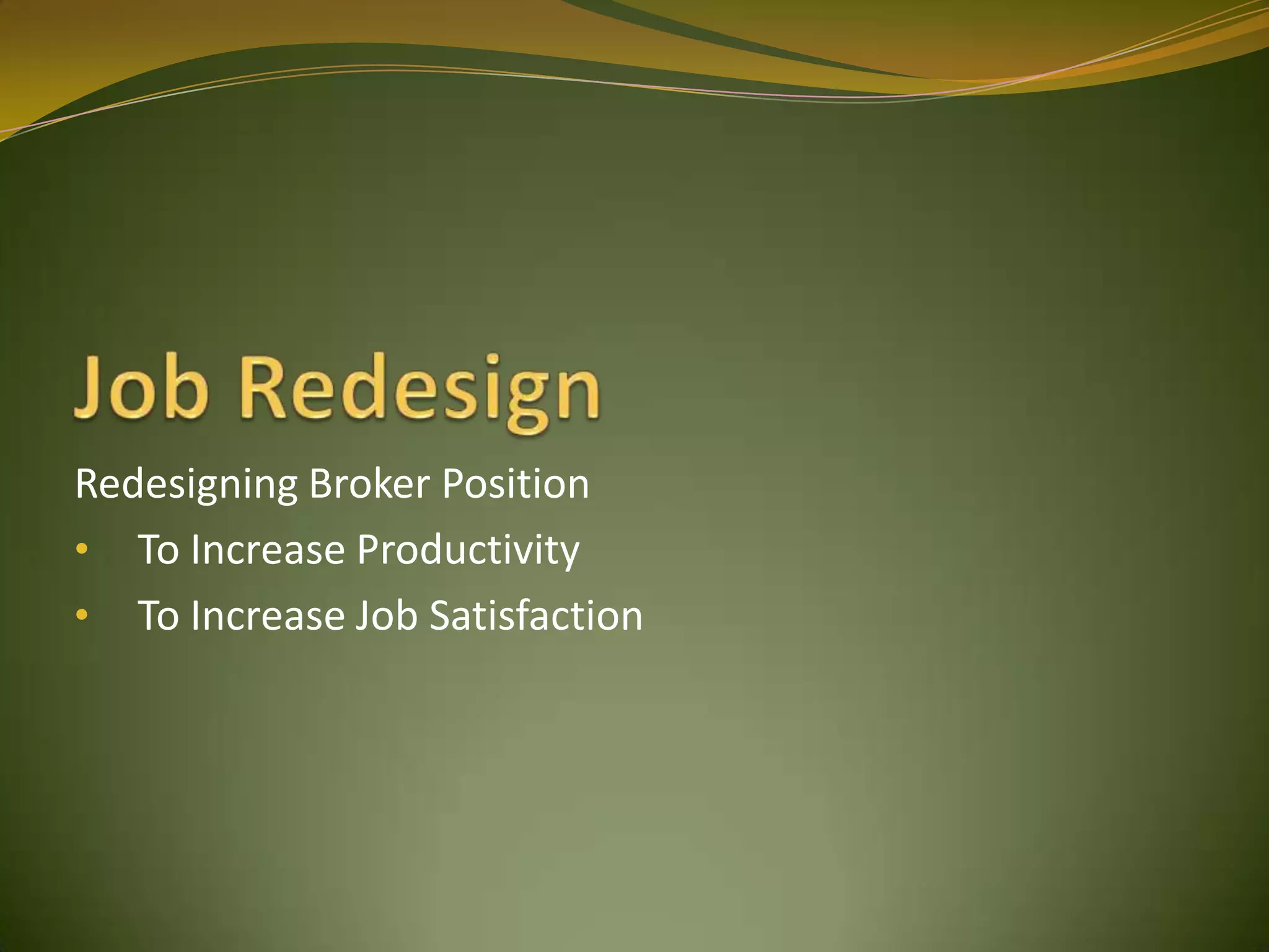 The document discusses redesigning broker positions to increase productivity and job satisfaction. It examines four approaches to job design and their advantages and shortfalls. The motivational approach focuses on needs, achievement, positive emotions, feedback, job satisfaction, and increased productivity. It recommends assessing needs, setting specific and achievable goals regularly, and designing jobs to encourage motivation and greater productivity.