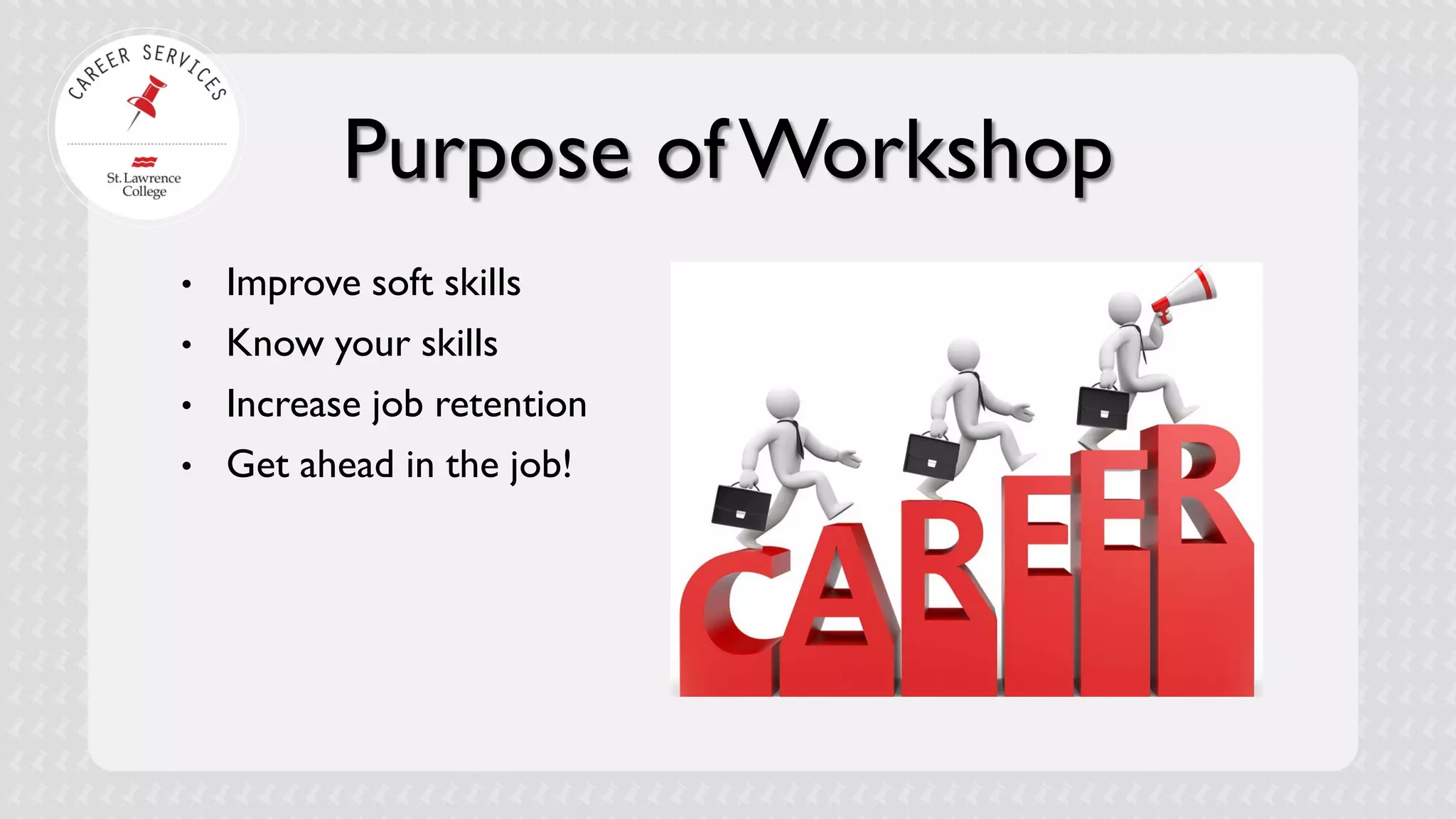 The workshop aims to improve soft skills, help participants identify their skills, and increase job retention. It covers topics like proper appearance, punctuality, attitude, communication, ethics, conflict resolution, and career development. Participants learn about making good first impressions, dressing appropriately, asking questions, continuing education, and getting along with supervisors and coworkers. The goal is to provide tools to help participants succeed in the workplace.