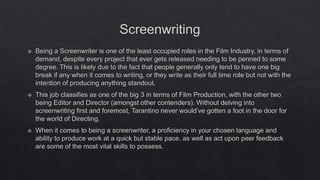 The document provides information about screenwriting as a career in the film industry. It discusses that screenwriting is one of the least occupied roles despite every project needing a script. It also discusses the skills needed for screenwriting like proficiency in language and quick writing pace. The document then examines the lack of diversity in the screenwriting industry, showing statistics on the low percentages of female screenwriters. It provides details about acclaimed screenwriter Steven Moffat's background and career. It discusses what inspires the respondent about Moffat's complex storytelling. The document ends with the respondent outlining their 5 year plan to pursue screenwriting, including current studies, potential university courses, needed work experience and skills to develop.