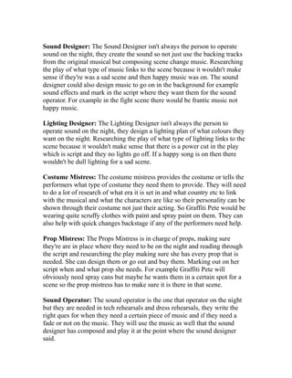 The stage manager is responsible for overseeing all backstage operations during a performance, including ensuring actors and props are ready at the appropriate times and communicating with other crew members. The deputy stage manager assists the stage manager and fills their role if needed. The front of house manager oversees all front of house operations like ticket sales and ushering audiences.