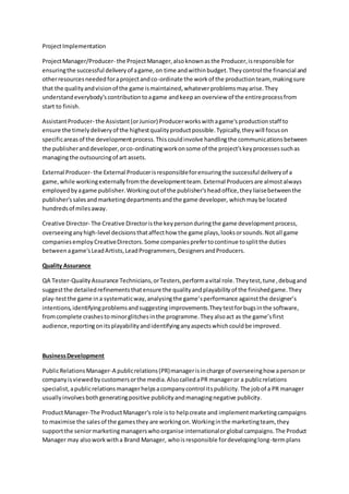 The document describes several roles in game development including designers, programmers, artists, producers, testers, and marketing roles. Game designers create the rules and structure of games. Programmers write the code to run and control games. Artists create visual elements like characters and environments. Producers ensure games are delivered on time and on budget by coordinating the team. Testers systematically test games for bugs and playability issues. Marketing roles work to promote games through advertising, public relations, and managing brands.