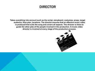 The director takes into account all aspects of production including the script, storyboard, costumes, props, target audience, floor plan, and locations to ensure an effective music video is produced that suits the song. Camera operators evaluate the storyboard to determine the best camera shots and angles to capture, working closely with the director. The lighting team provides relevant lighting for each scene of the music video and works with the director to achieve the best possible outcome through lighting. The sound editor prepares the sound and music for the final edit and ensures proper audio equipment is used during shooting.