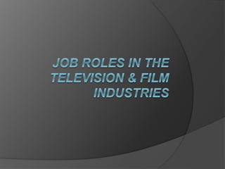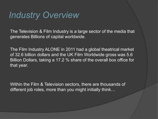 The document provides an overview of the television and film industry, describing its global revenue. It then discusses the thousands of job roles that exist, categorizing them as production/management, creative, or technical. Specific job roles are profiled like producer, director, editor, and production manager. The document notes that many in the industry work freelance, with contracts typically lasting 3 months but with irregular hours and periods without work. Overall, freelance provides opportunities to work various jobs but can also lack stable income.