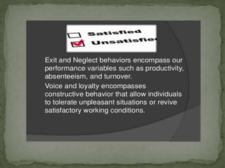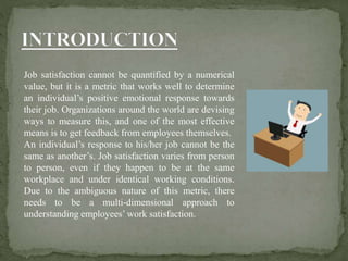 This document discusses job satisfaction, including that it is an individual's positive emotional response to their job that varies between people. It also discusses that organizations measure job satisfaction through employee feedback to understand it. The document notes that job satisfaction is influenced by personal, job-related, and management-controlled factors and relates to productivity, absenteeism, and turnover.