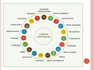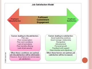 The document discusses job satisfaction, highlighting its two main types: affective and cognitive job satisfaction, and various theories that explain it, such as Locke's range of affect theory and Herzberg's two-factor theory. It also addresses environmental and individual factors influencing job satisfaction and mentions measurement tools like the Brief Index of Affective Job Satisfaction and the Job Descriptive Index. Reasons for job dissatisfaction include workload, competitive remuneration, lack of performance recognition, and monotonous work.