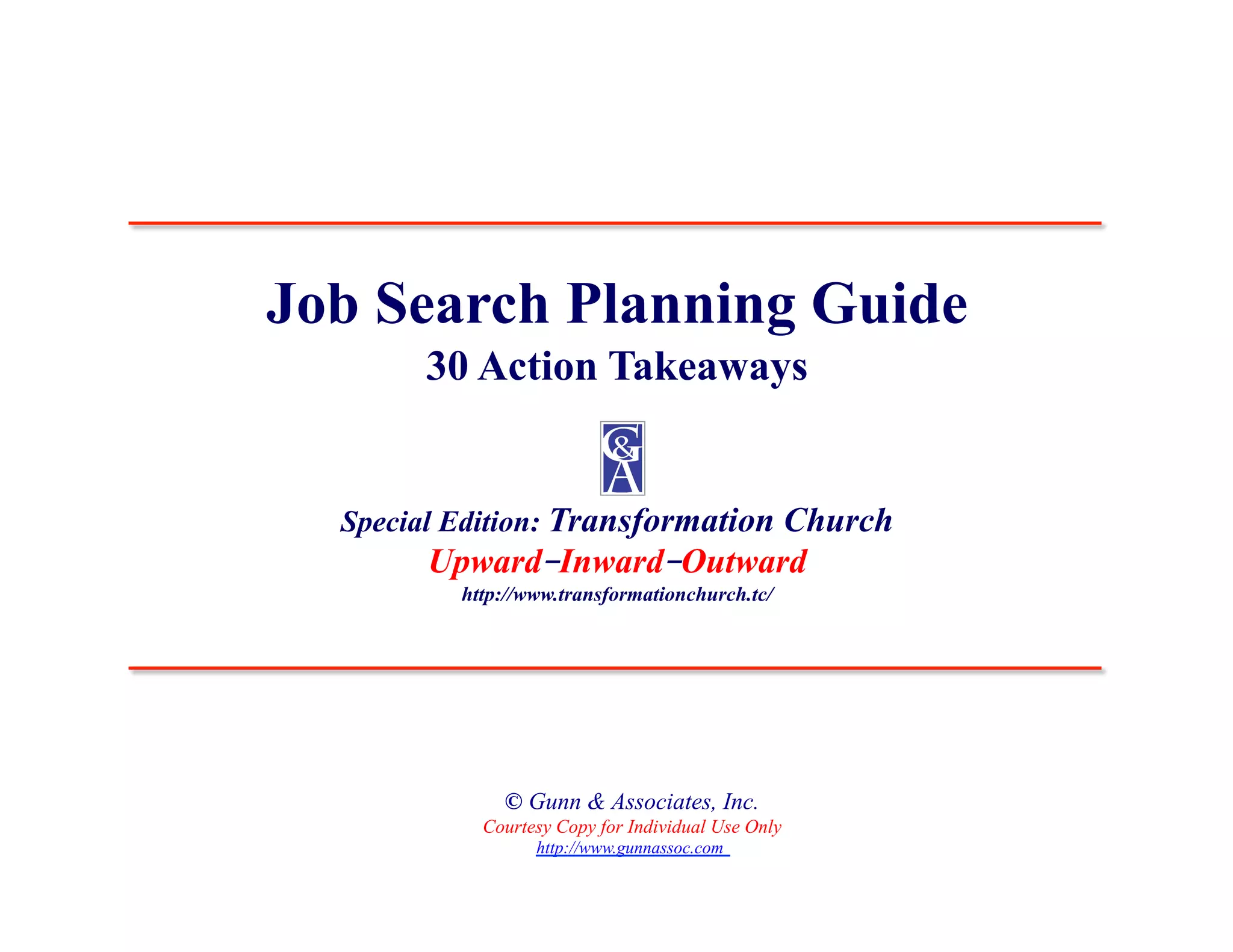 The document is a 30-page guide for planning a job search, created by Gunn & Associates and customized for Transformation Church. It provides 30 action items or "takeaways" to help with tasks like creating a concise resume, developing an elevator pitch, targeting companies and industries, using social media and websites, and maintaining accountability. The guide emphasizes communicating value through achievements and action verbs, and organizing one's efforts through targeted outreach, online presence, and support systems.